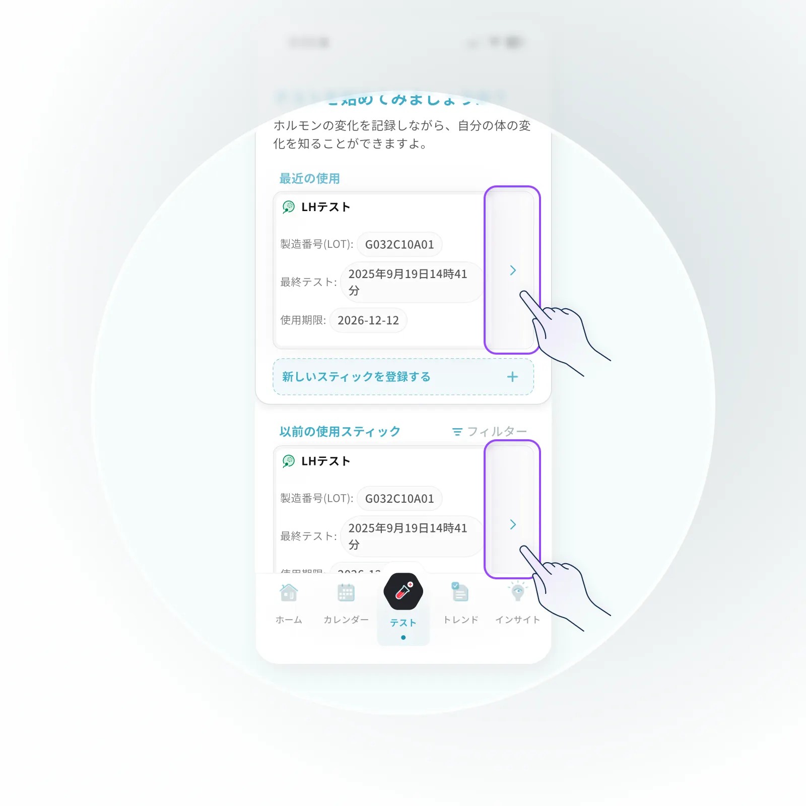初回登録の際にQRコードのスキャンまたはLOT番号の入力を完了していれば、以後は同じLOTのスティックを使用する際に「続ける」ボタンを押すだけで、すぐにテストを開始できます。