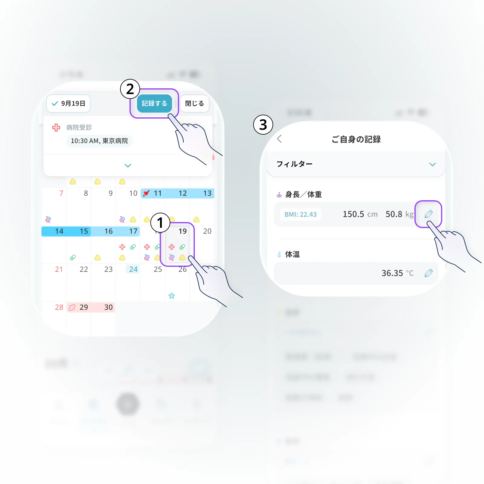 ここでは、身長・体重・体温・症状・性交の有無・通院・服薬・運動記録などを簡単に入力できます。