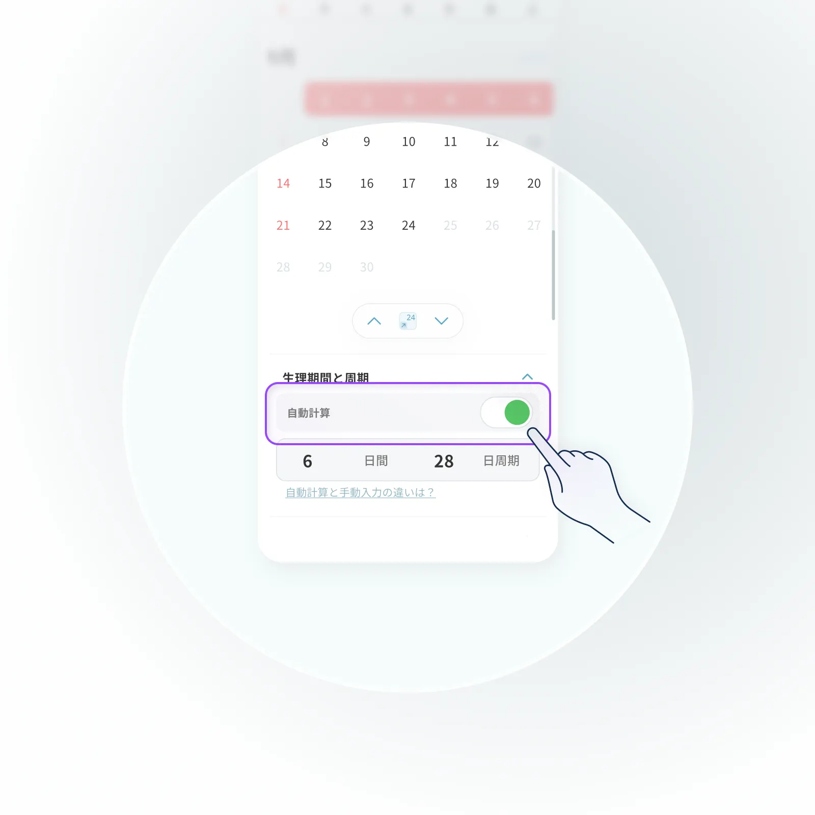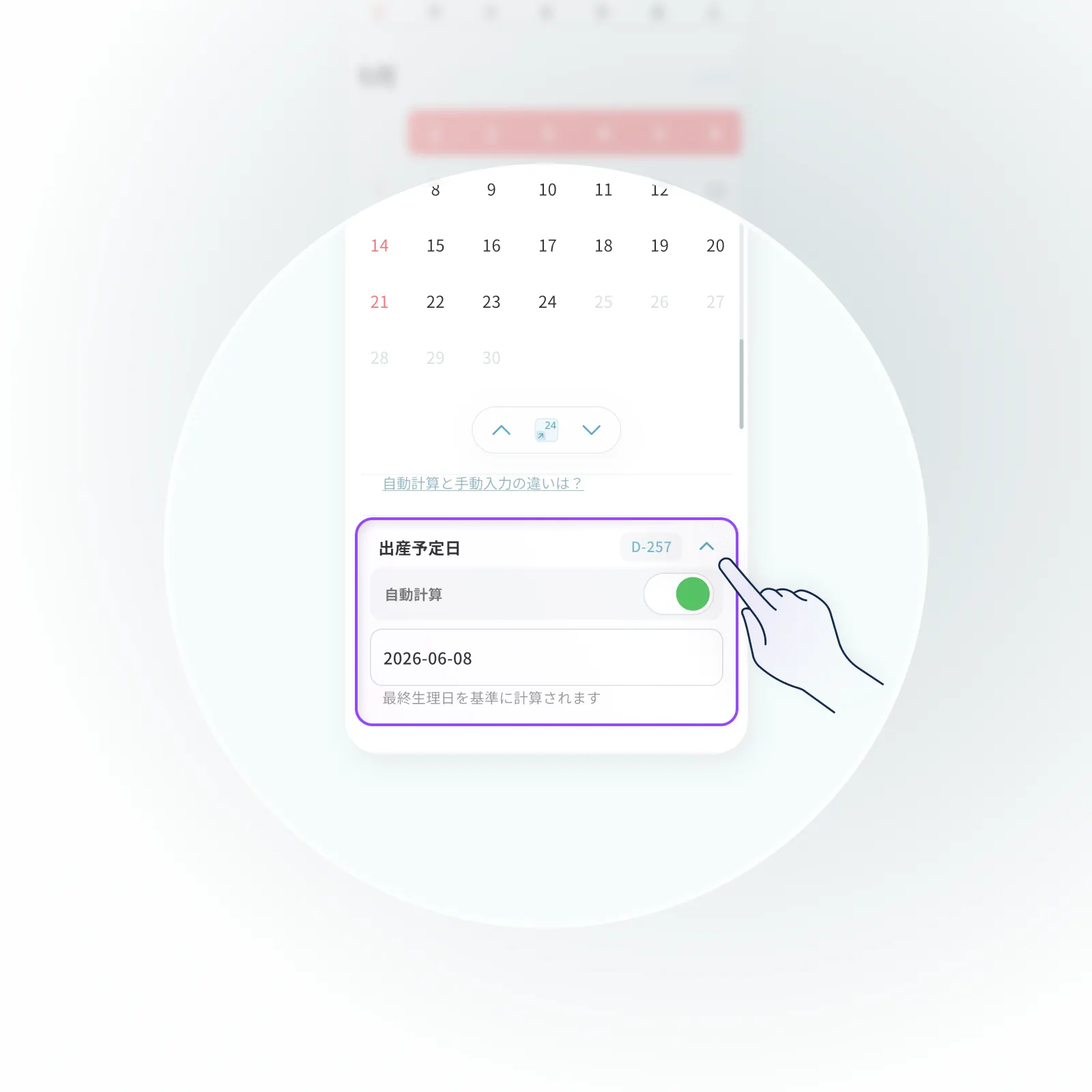 「自動計算」トグルをオンにすると、最後の生理開始日を基準に予定日が自動で計算されます。