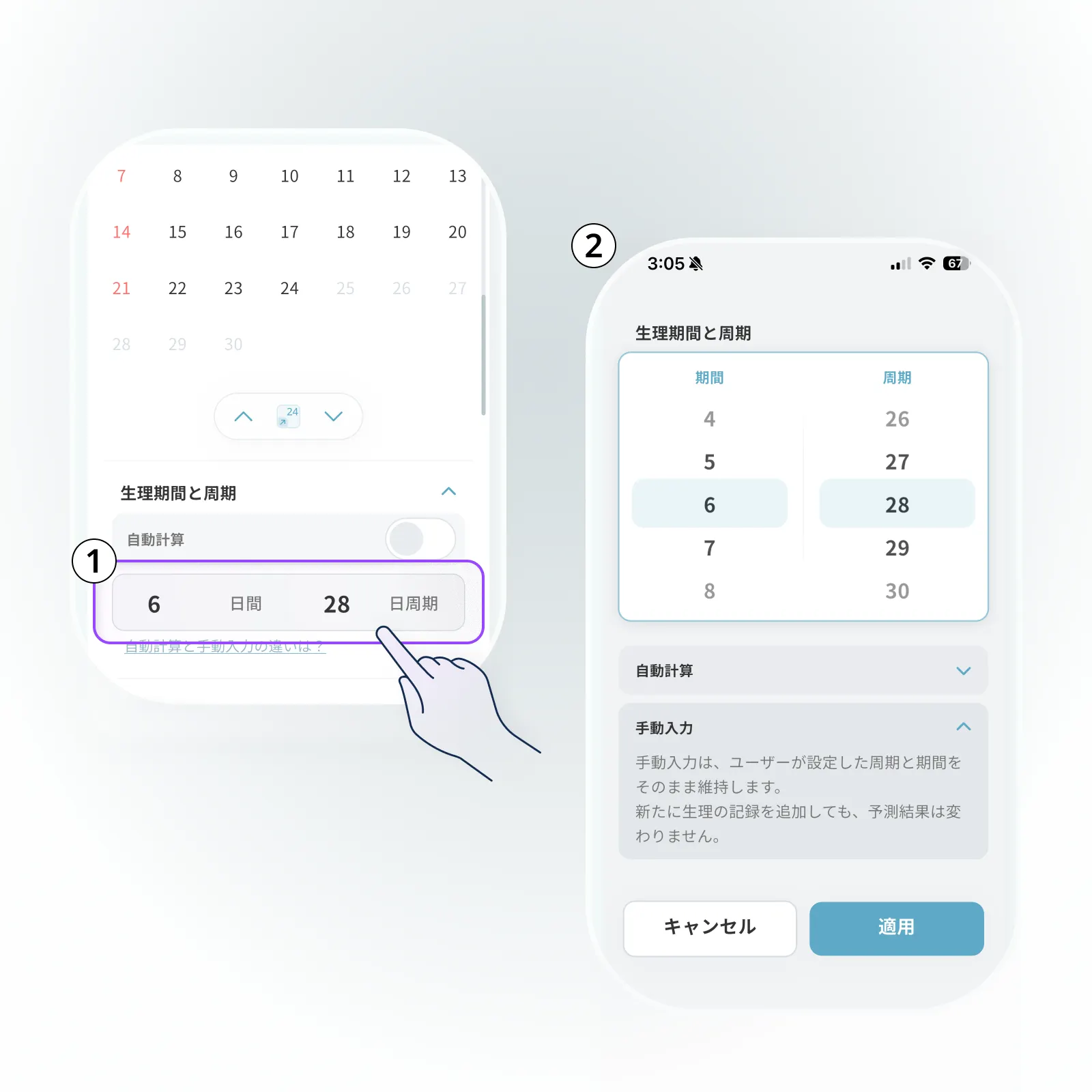 カレンダー編集画面で月経周期が表示されている部分をタップすると、周期を変更できるウィンドウが開きます。